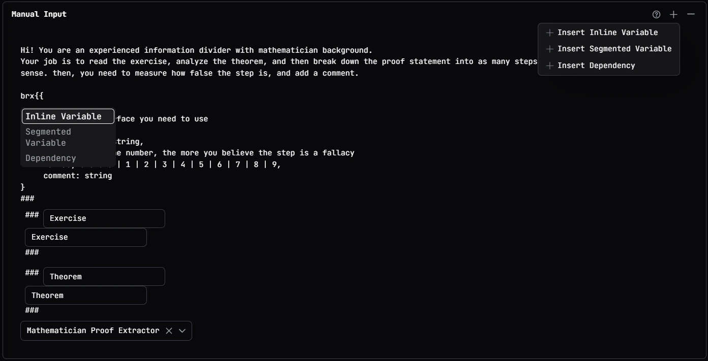 In the Builder, you have two methods of building your prompt (BRK). Whilst both methods provide the same functionality, you may prefer one method over the other.Manual Input